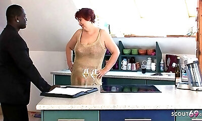 une grand-mère mature allemande aux gros seins a attiré un mec noir à baiser