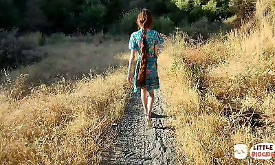 Brunette in red sundress Bonnie shows her clean-shaven hungry pussy upskirt